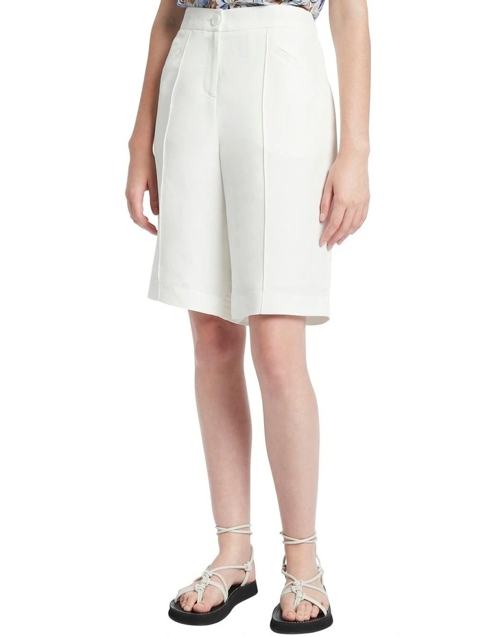 Showing off a flattering knee length within a boxy fit, these crisp white shorts will be your go-to all through summer. The shorts are made from a linen twill blend fabric for a comfortable, tailored fit, and are completed by a classic button and fly front closure, slanted welt front pockets, faux welt back pockets, and a pin-tuck detail front seam.Β
