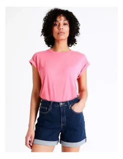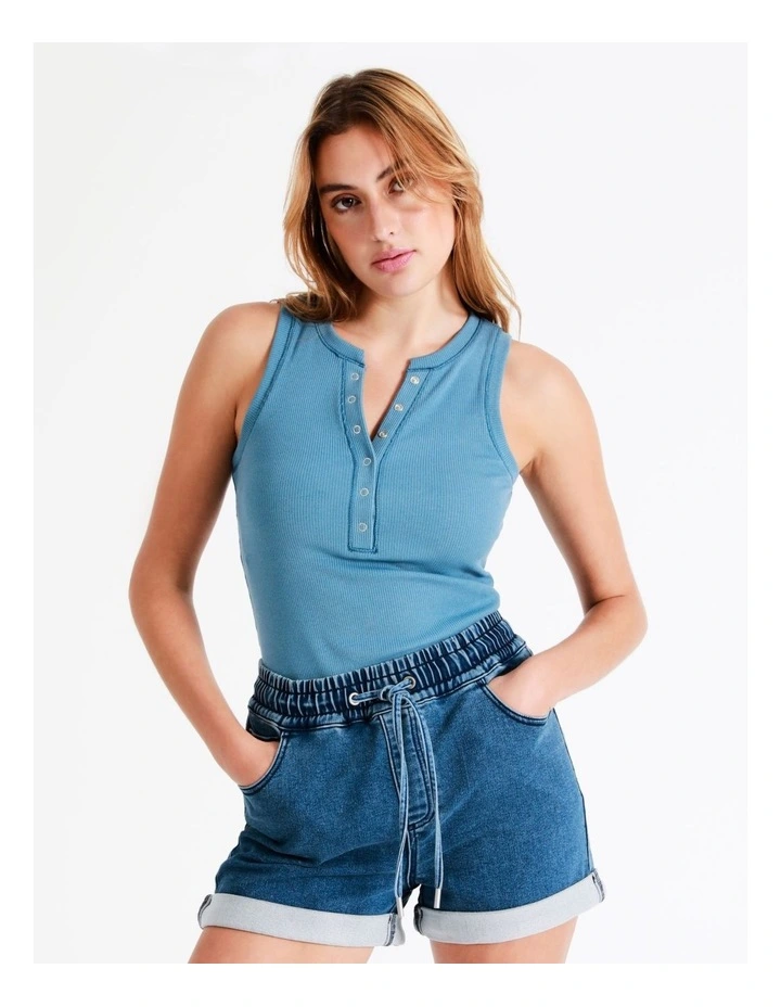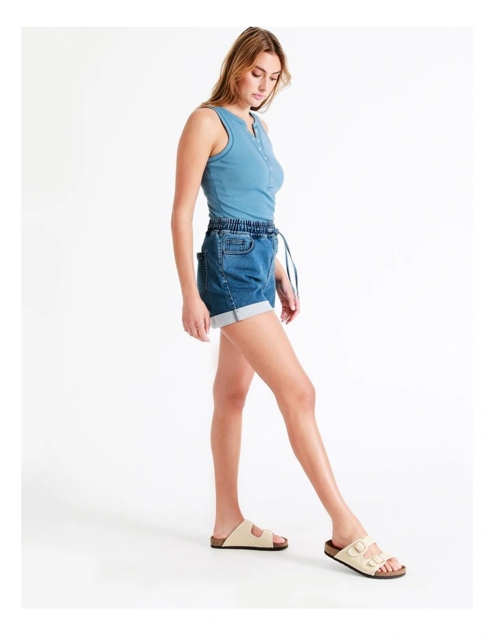 Style a chic everyday look with a denim short. This short has a crop design and boasts a drawcord at the waist for an adjustable silhouette. Wear it with your best white tee for the perfect off-duty outfit.Β