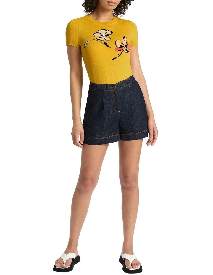 Moving easily through soft cotton denim, these deep blue shorts flatter using neat A-line shaping within an effortless relaxed fit. Utilising an eco friendly wash, the shorts continue their appeal with a neat button and concealed fly front closure, handy belt loops at the elasticated waistband, and functional pocketing at the hip.