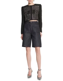 Revealing statement Bermuda short shaping, these denim short curve close through the waist, before flaring out in a relaxed wide leg to knee length. True indigo in colour, the shorts are made from all-cotton denim, further enhanced by statement magenta topstitching, a button and concealed fly front closure, and classic five pocket jean styling.