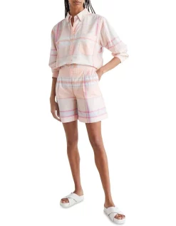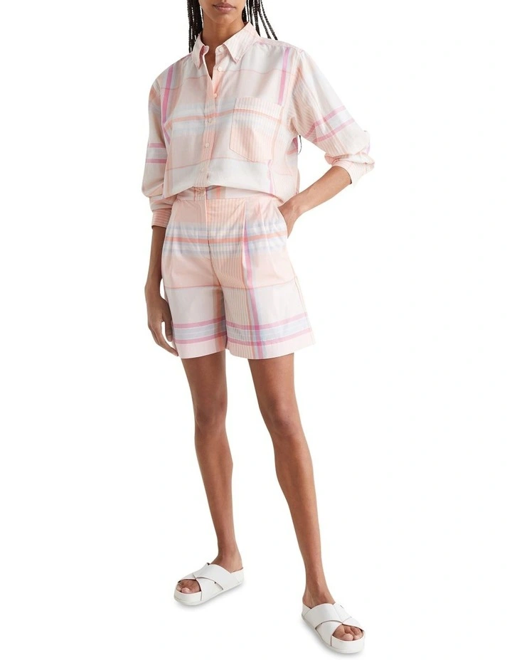- Pleated Madras check Two side angled pockets Two back welt pockets TH monogram embroidery at hip Tommy Hilfiger branding Tommy Hilfiger flag embroidery at back Relaxed Fit